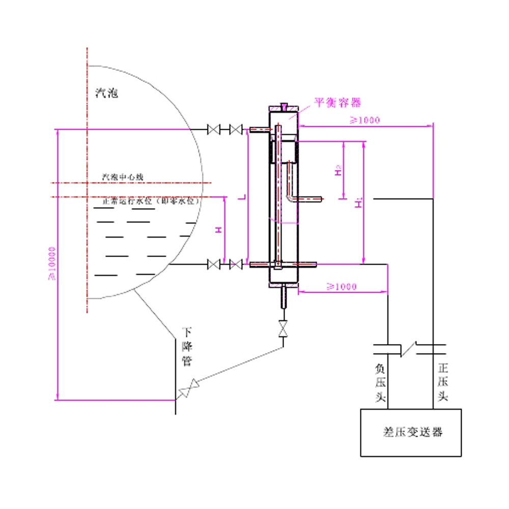 The balance container consists of a positive pressure pipe, a negative pressure pipe, a down pipe, a funnel, a water cup, a connecting pipe, etc. The balance container is directly connected to the boiler steam and water. During the working process, the heat released by the condensation of saturated steam heats the positive pressure pipe and the negative pressure pipe at the same time, and the outer insulation of the balance container can reduce the loss of heat, thereby reducing the weight of the water in the positive pressure pipe under any working conditions. are approximately equal to the weight of the water in the bubble; when the water level in the drum is constant, no matter how the pressure in the drum changes, the pressure changes in the positive pressure pipe and the pressure pipe in the negative pressure pipe are equal, so the difference in the output of the double-chamber balance container Pressure remains unchanged. Once the water level changes, the output differential pressure also changes accordingly, which can display the water level in the container in a timely manner.