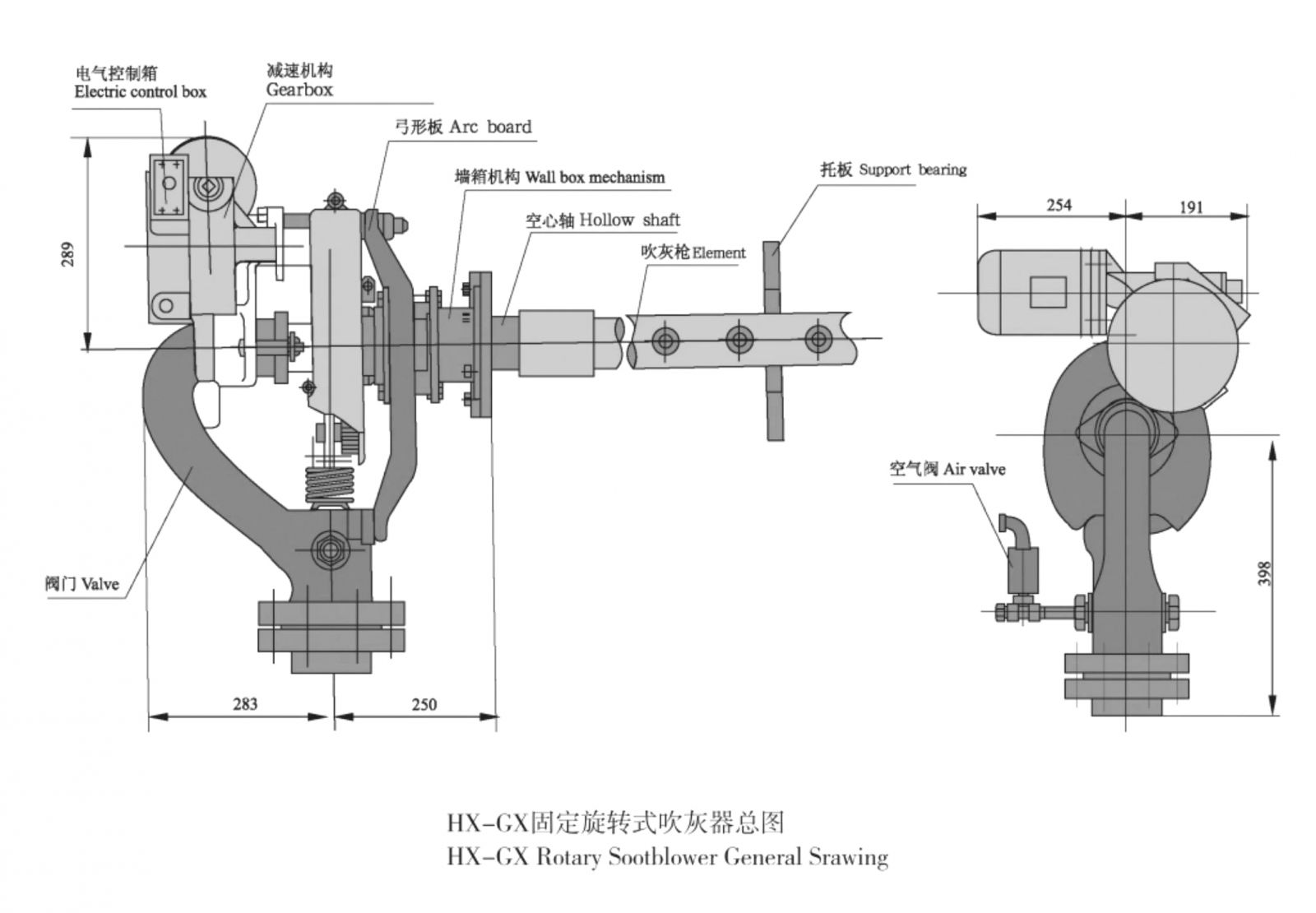HX-GX吹灰器主要由鵝頸閥、空心軸、吹灰槍、減速傳動機構與弓形板、電氣控制箱、爐墻接口裝置、爐內托板 等組成。