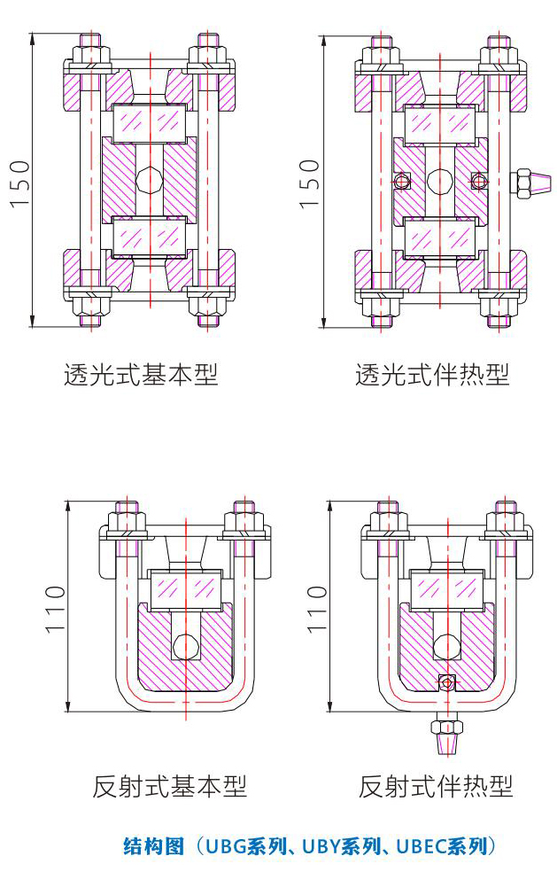 UBG系列、UBY系列、UBGY系列高溫高壓玻璃液位計由表體、上閥門、下閥門、排污閥(或排污法蘭)、放空閥(或放空堵頭)組成。上下端安裝法蘭與容器上對應法蘭相連構成連通器、透過玻璃板可直接觀察到容器內液位的實際高度,上、下閥門內均設有安全保護裝置,當玻璃板意外損壞時,保護鋼球在容器內壓的作用下自動密封,防止容器內液體繼續外泄。