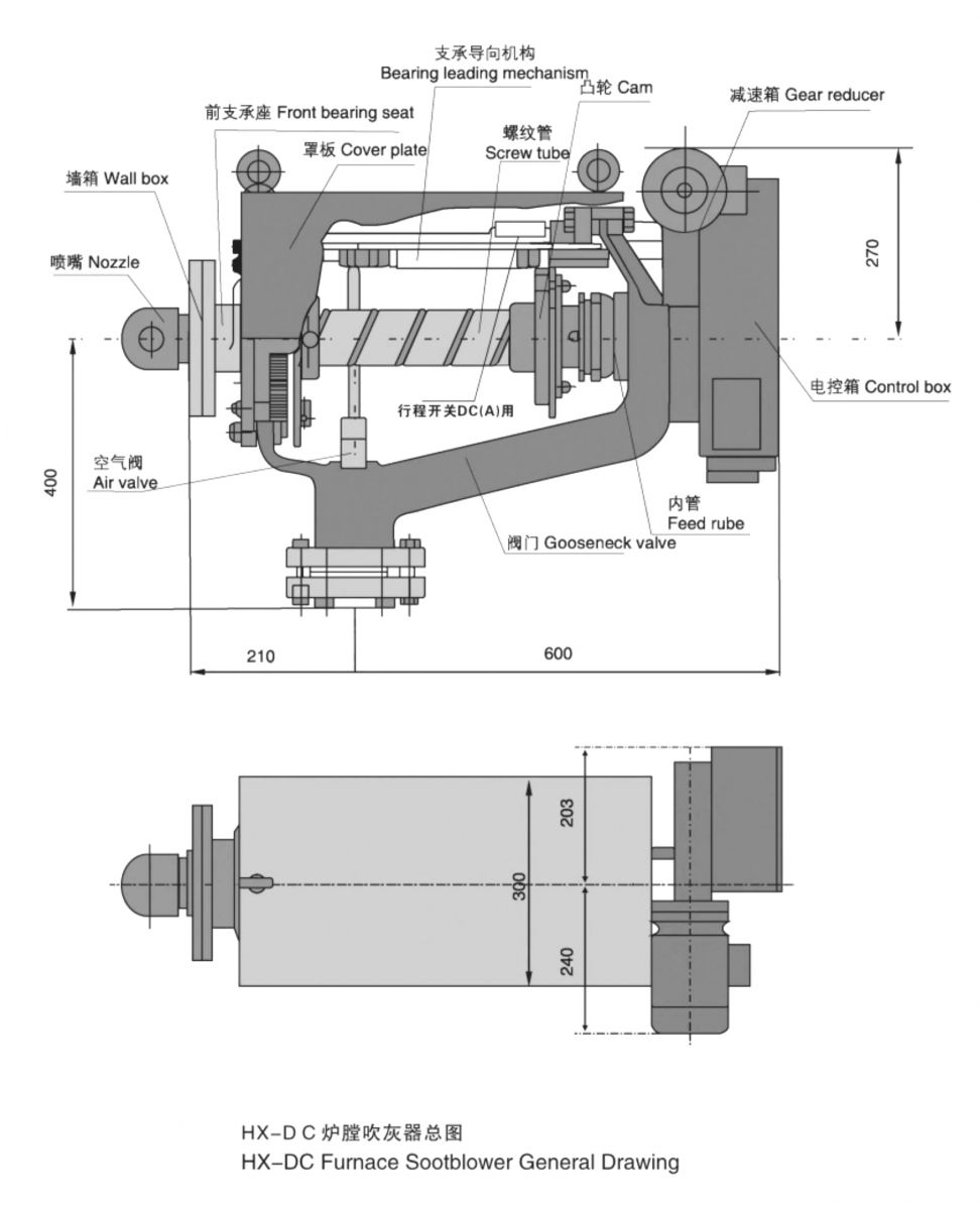 HX-DC吹灰器主要由鵝頸閥、內管、吹灰槍與噴頭、減速傳動機構、支承板、導向桿、電氣控制機構、防護 罩組成。